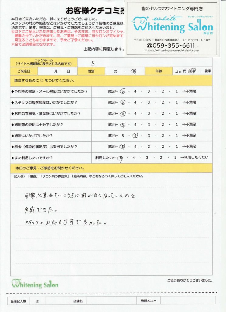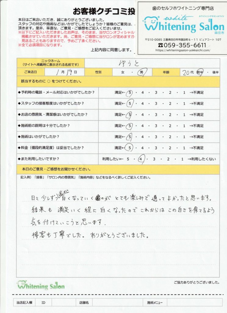 日々少しずつ歯が白くなっていくのがとても楽しみで通ってよかったと思います。
